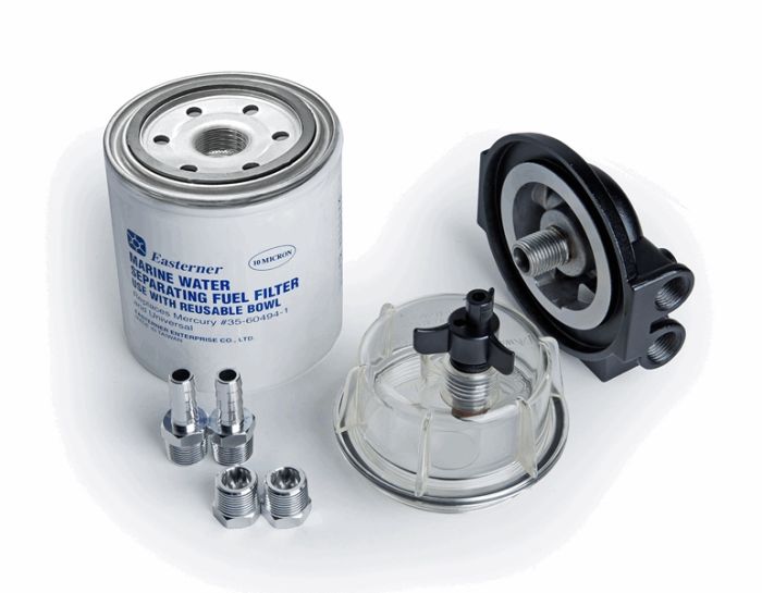 Топливный фильтр-сепаратор с установочным кронштейном из алюминия и прозрачным водосборником для топливных систем 4-тактных двигателей Mercury.