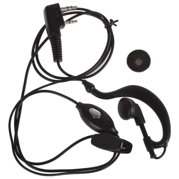 Штатная гарнитура, идущая в комплекте с большинством радиостанций Baofeng. Стандартный, самый распространенный среди портативных радиостанций, двух-штырьковый разъем позволяет использовать данную гарнитуру не только с радиостанциями марки Baofeng, но также с множеством моделей таких производителей как Vector, Lira, Comrade, Turbosky, Kenwood и многими другими. Гарнитура имеет простую и понятную конструкцию. Вставляемый в ушную раковину небольшой наушник надёжно фиксируется с помощью пластмассовой скобы, надеваемой на ухо. Благодаря этому можно бегать, совершать прыжки и другие резкие движения без опасения, что амбушюр выпадет из уха. Для удобства пользователя в комплектацию добавлена поролоновая насадка на наушник, что делает его эксплуатацию более комфортной. На проводе размещён небольшой пульт управления, с помощью которого можно регулировать громкость. Чтобы предотвратить риск зацепиться проводом за ветки и другие препятствия во время передвижения, в комплектацию входит зажим. Он фиксирует провод на одежде или рюкзаке, не позволяя ему свободно двигаться.