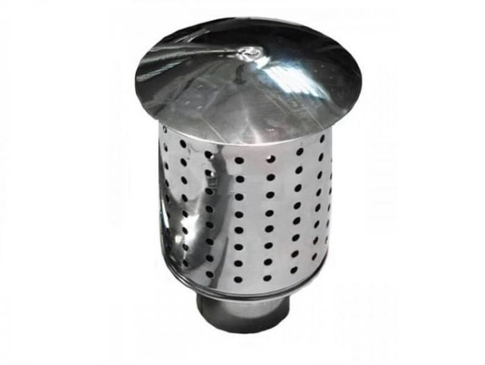 Искрогаситель - насадка на трубу в виде перфорированной емкости. Эффективно гасит и улавливает искры вылетающие из трубы дымохода. Крышка искрогасителя открывается для чистки и перевозки внутри печки. Материал: сталь нержавеющая AISI 304 (высоколегированная, НЕМАГНИТНАЯ), корпус: 0,5 мм., труба: 0,4 мм.