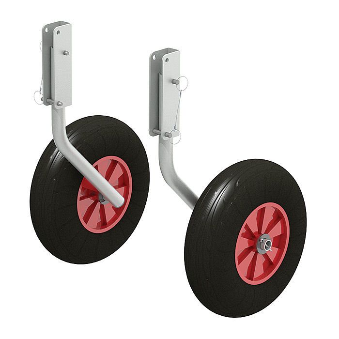 Транцевые колеса предназначены для ручной транспортировки надувной лодки. Имеют два фиксированных положения. Допустимая нагрузка 120 кг. Крепеж, входящий в комплект, позволяет устанавливать колеса на транец толщиной до 32 мм. Давление в надувном колесе не должно превышать 1,2 бар! Диаметр: 260 мм., материал: оцинкованная сталь, страна производителя: Россия.