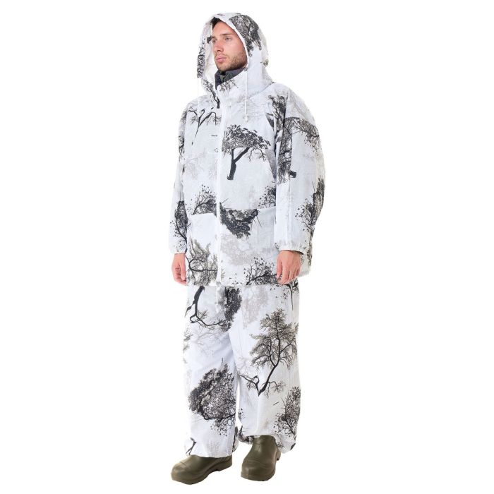 Зимний маскировочный костюм "Метель". Для зимней охоты. Одевается поверх зимней утепленной одежды. Предназначен для маскировки в зимнем лесу, на заснеженном поле. В нем вы не будете цепляться за ветки деревьев. Не бликует на солнце, позволяет охотнику полностью слиться с окружающей местностью, не шуршит на морозе. Особенности модели: куртка имеет прорези для доступа в карманы зимней одежды, капюшон стягивается шнуром с фиксатором, резинка по поясу и низу брюк. Страна производства: Россия.