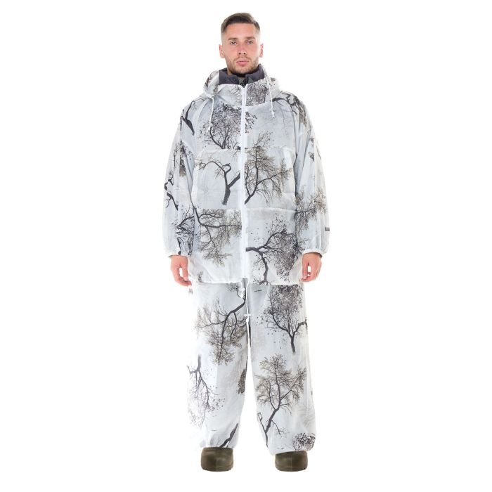 Зимний маскировочный костюм "Метель". Для зимней охоты. Одевается поверх зимней утепленной одежды. Предназначен для маскировки в зимнем лесу, на заснеженном поле. В нем вы не будете цепляться за ветки деревьев. Не бликует на солнце, позволяет охотнику полностью слиться с окружающей местностью, не шуршит на морозе. Особенности модели: куртка имеет прорези для доступа в карманы зимней одежды, капюшон стягивается шнуром с фиксатором, резинка по поясу и низу брюк. Состав: 100 п/э. Страна производства: Россия.