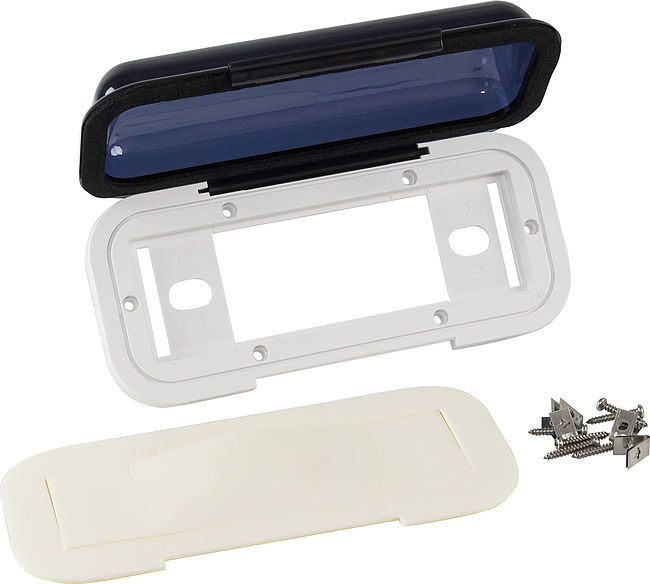 Крышка влагозащищенная (стандарт влагозащищенности IP65) для звуковоспроизводящей аппаратуры. Лицевая панель крышки изготовлена из прозрачной тонированной пластмассы. В комплект входит крепеж.