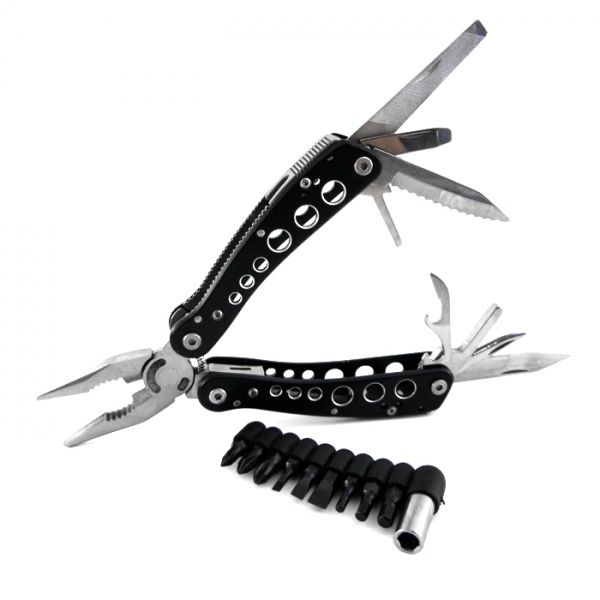 подпружиненные пассатижи с кусачками, два лезвия (с прямой и серрейторной заточкой), пара шлицевых отверток, напильник, открывалка для консервов и бутылок,