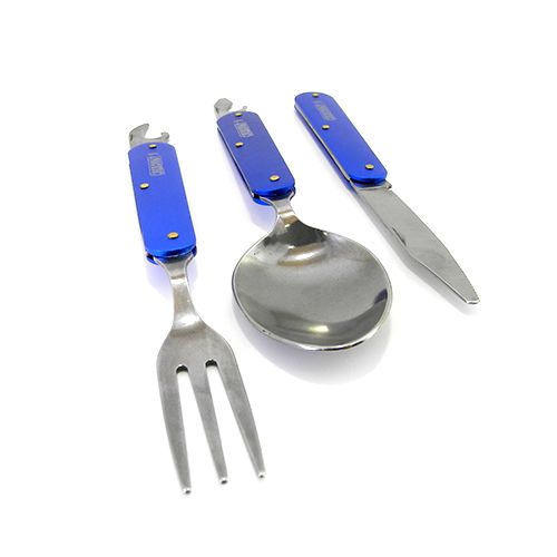 Компактный набор столовых приборов, состоящий из 3 предметов, необходимых в походных условиях. Комплект: ложка, вилка, нож, чехол. Материал: нержавеющая сталь. Длина приборов: 16 см.