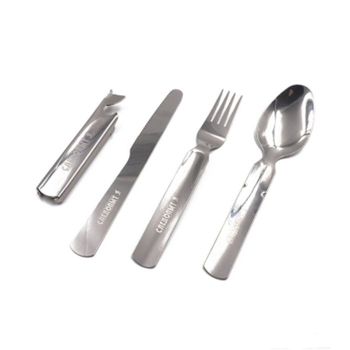Компактный набор столовых приборов необходимых в походных условиях. Комплект: ложка, вилка, нож, открывалка. Материал: нержавеющая сталь.