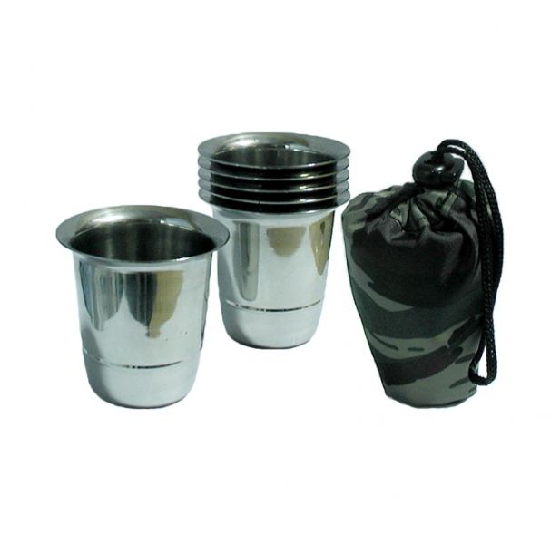 Набор туристических рюмок в чехле, шесть шт. Объем рюмки – 0,1 л, вес – 0,1 кг. Упаковывается в чехол. Изготовлено из нержавеющей стали AISI 304 методом холодной штамповки.