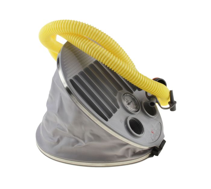 Ножной насос с камерой объемом пять литров изготовлен из полиамида, упрочненного стекловолокном, «гармошка» - из армированного ПВХ. Все металлические детали выполнены из нержавеющей стали. Встроенный манометр позволяет контролировать давление во время накачивания лодки. Тип насоса: ножной, материал: пластик, ПВХ, макс. давление: 0.4 Bar,