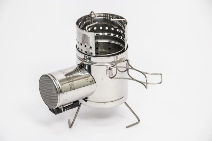 Компактная и легкая печь, стабильно работает при отрицательных температурах, не требует заготовки большого количества дров. Благодаря наличию нагнетателя, развивает высокую мощность. В качестве топлива можно использовать любой подручный материал: дрова, ветки, шишки, древесный уголь, торф, сухую траву. Печка имеет двух камерное устройство. Воздух под действием нагнетателя проходит полость первой камеры и попадает в камеру сгорания. При этом воздух сильно нагревается и благодаря этому горение происходит эффективно даже при низком качестве топлива. За счёт чего увеличивается кпд печки и температура пламени. Мелкие отверстия диаметром 5 мм способствуют более эффективному смешиванию не сгоревших пиролизных газов с кислородом и дожигает его, что так же повышает кпд печки. Двойные стенки печки играют роль термоса, не позволяя охлаждаться камере сгорания. При снятом вентиляторе печь продолжает работать за счет естественной тяги. При этом происходит спокойное горение топлива, удобное для продолжительных режимах приготовления пищи. Технические характеристики: Размер в сложенном виде - 140×140×140 мм. Диаметр - 140 мм. Вес - 720 гр. Объем - 1,5 л. Элемент питания - AA. Кол-во элементов питания - 2. Материал - нержавеющая сталь. Толщина стали - 0,4 мм.