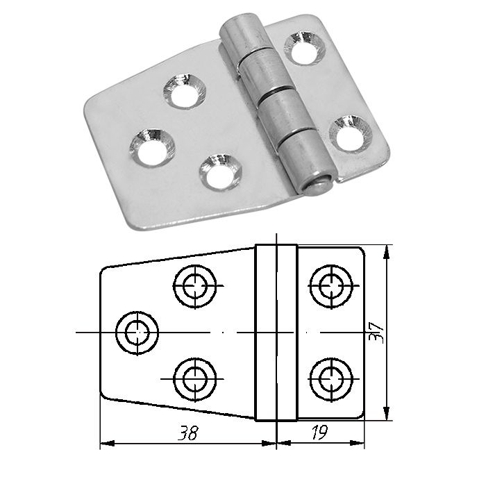 Асимметричная неразъемная петля с пятью крепежными отверстиями, предназначена для установки на крышки рундуков, кухонной мебели.