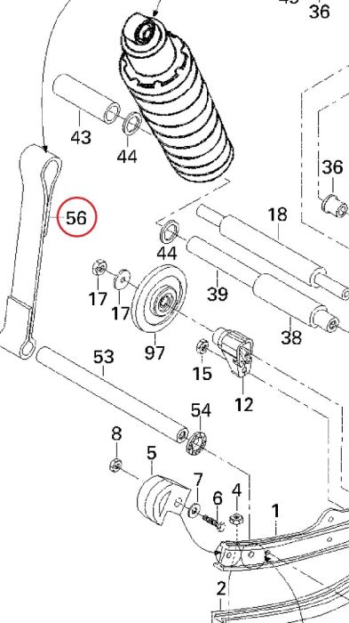 Ремень-ограничитель хода задней подвески Ski-Doo. Для снегоходов: Skandic 600 SUV (2003), Skandic 550F SUV (2004), Skandic 600 SUV (2004), Skandic 550F SUV (2005), Skandic 600 SUV (2005), Skandic 550F SUV (2006), Skandic 600 SUV (2006), Skandic 550F SUV (2007), Skandic 600 SUV (2007). Номер на рисунке: 56.