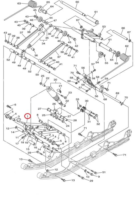 Рычаг передний задней подвески Yamaha. Для снегоходов: Yamaha VK 10 (RS Viking Professional, VK Professional II EPS, VK Professional II), Yamaha VK540 (VK540 II, VK540 III, Viking 540, Viking 540 ER, VK540 V, VK540 IV, VK540 III SP). На схеме номер - 1. Производитель: Yamaha (Япония).