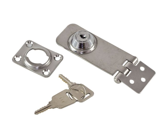 Запор с ключом для крышек рундуков и мебельных шкафчиков. Изготовлен из нержавеющей стали. В комплект входит два ключа.